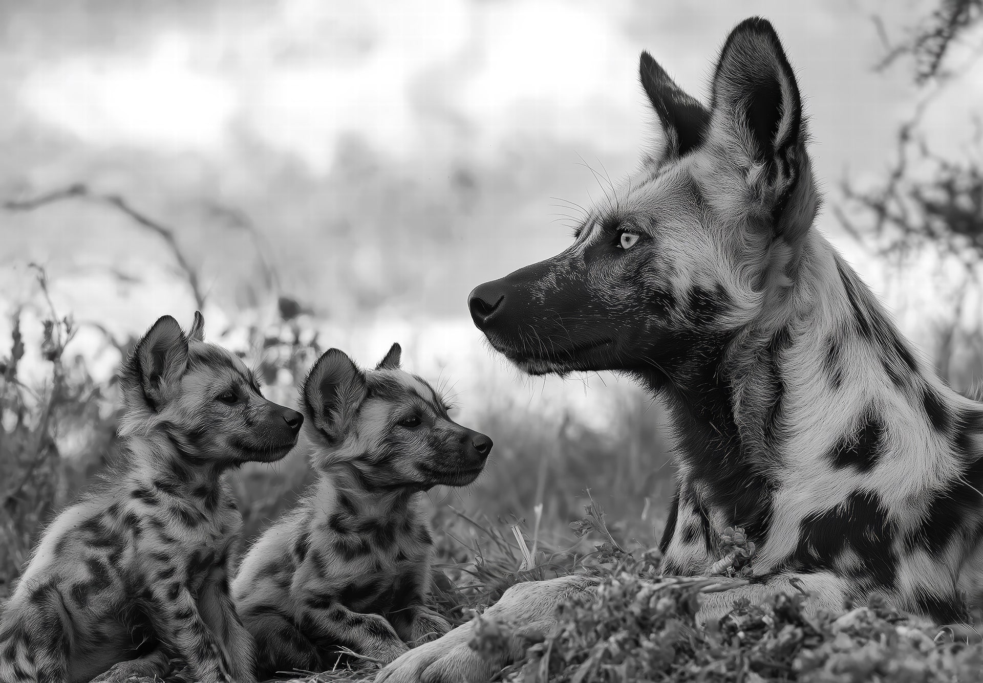 In the quiet of the moment, she lies still, her body a shield for her tired pups. Their gentle breaths mirror the calm that surrounds them, yet her eyes—sharp, unwavering—remain fixed on the distance. A storm brews, a call to action looms. But for now, they rest. She is their protector, and nothing will disturb their peace.